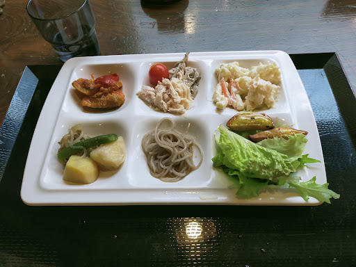 ◯サラダバーの種類 野菜が数種類&ドレッシング、野菜スティック3種&手製みそディップ、ポテトサラダ、マカロニサラダ、杏仁豆腐・大学芋、こんにゃく麺(?)、手製惣菜1〜2種類、市販のパン数種類など。