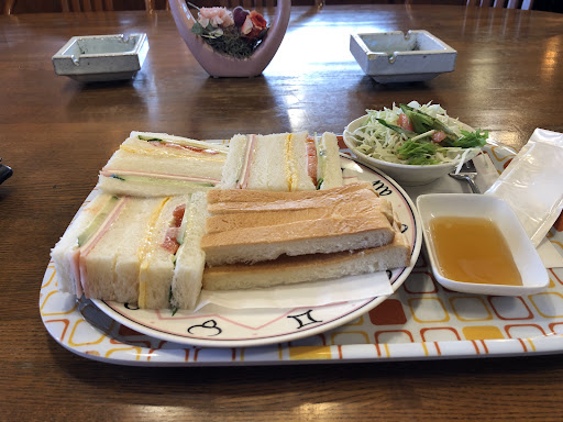 Read more開店してすぐお邪魔したのですがすごく空いておりすんなりと来店、店内を見てみると昭和感を感じるような内装でわかる人には懐かしい内装で、メニュー表を見るとどれも魅力的なメニューでしばらく悩みましたが、私の選んだのはミックスサンドイッチセット、コーヒがセットで950円ぐらいで注文してしばらくするとやって来ました、見た感じは普通のサンドイッチセットですが右下のお皿に入ってるのは何だろう、サラダにかけるのか? サラダには既にドレッシングがかかっている、私は試しにフォークを使って舐めてみた、するとなんということだろうか。 これはメープルシロップだった。 パンの耳が山盛りになっているのでこれをディップして食べるのであろう。 とにかく美味しいサンドイッチですが、コーヒーは香りが弱いと私は感じましたがこれはこれで良いのではないでしょうか。 とりあえずごちそうさまでした、次回来店する時はチーズフォンデュを食べてみたいと思います。 注...