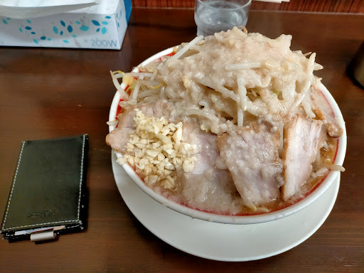 メニューを見て、大盛こってりメンマらーめん全マシをオーダーしました。 麺は自家製麺らしく、中〜中太麺の丸みを帯びた麺でもっちりつるつるしており、麺旨し! スープは、味濃い目な二郎インスパイア系な味で御座いましたが、松さんオリジナルな感じの味でややラーメン二郎とは味が違って、コレはこれで旨いです。 具は、メンマトッピングをしたのでメンマたっぷりで、モヤシ大量のキャベツ少なめ、チャーシューは薄切りなチャーシューが三枚乗ってました。背脂もマシにしたので、程良く脂感を味わえ、らーめんに良く合います!!あと、角切りな刻みタマネギを着丼と同時に持ってきて下さり、タマネギがこってりらーめんにこれまた良く合います。