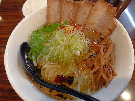 平日20時頃来店 天候雨、10度以下の寒い日 店内は座敷(小上がり)に結構人 会計は券売機で食券買うタイプで現金のみ 新札使えた 店内に入ると人数確認して、1人だったのですぐにカウンターのお好きなところどうぞと声かけられ、テーブルにつくと食券取りに来て、水かと思いきや冷たいお茶サービス 何茶かわからんが美味い 厨房は女性スタッフさんが麺茹でし、盛り付け配膳は男性スタッフ2人 淡麗塩ラーメン(930円)、トッピングチャーシュー(230円)、ライス小(130円)注文 最初にライス小来たが、スタッフの人の指入って持ってきた笑 しかもそんなに熱くなく、熱いの好きだからラーメン届くまでに更に冷えて残念 5分〜でラーメン届く 割り箸だ 寒かったので着てきたジャケットを置く場所がなかったが、入り口付近にかごがあったので声を掛けると使っていいと言われ席に持ってきて荷物入れる ラーメンの上にはたっぷりのネギと、細長いメンマが大量と、トッピングのチャーシューが思った以上にでかいの4枚 結構柔らかいし、分厚く、味もしっかり乗ってて、テーブルにある柚子胡椒をさっとかけるとめちゃ美味い 実は塩ラーメンに胡椒ガッツリかけるのが好きなので、胡椒を探すと、レッドペッパーのホールっぽいのがあったので、ミルで削るタイプか?とスタッフさんに声をかけると、 「うちは胡椒はありません!」 と一蹴された!! 自信のラーメンなんだと逆になんて最高なんだと混ぜながら麺を見ると、結構白い少し太めのストレート麺、モロヘイヤの麺もあるみたいだがまずは塩 つゆはしっかり目に濃い 濃厚塩もあるので、淡麗はあっさりかと思ったら、意外にしっかり目 美味い スープに黒い液体がかかってるのは何かわからんが、マー油とかネギ油か?程よいアクセントだけど何かわからなかったが不思議な味がした 醤油の注文も多いが、塩も多い、珍しい カウンター席の隣の席に人が来たが、全然気にならん距離感と広さ パーテションがあるわけでもないし、隣とは存外近いけどなんかいい感じのカウンター ただ、ほんの少し段差があるから気をつけるべし 惜しいのは餃子なし ラーメン=餃子が最高だと思ってるから、最初からネット検索でメニューにないと分かっていたものの、やはり本当になかった ライスにチャーシューオンしてスープをつゆがわりにスープも完食 満腹すぎる小ライスの量は普通のご飯茶碗一膳より多いと思う 常に満席が続き、食後に店から出ると駐車場はほぼ満車 めちゃ美味しかったが、ここはたまにでいいかな? 餃子が食べたい!ライスもあるし 最近はライスがない店舗も多いので、良...