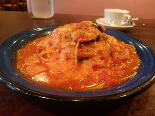 ランチのメインの料理はカレー・スパゲティ・ロコモコがあり、 それぞれの種類ごとにレギュラーメニューと日替わりも含め、いくつかバリエーションがあります。 どれもおいしいので、迷うほどです。 個人的にはスパゲティのシシリアンがオススメです。