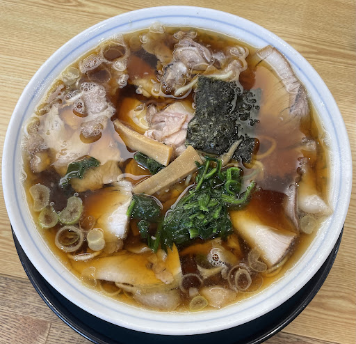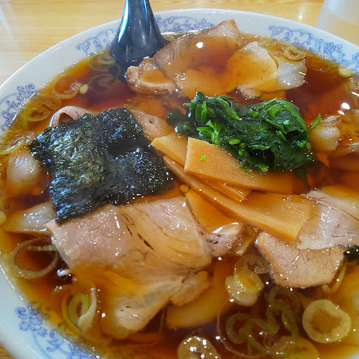 今日は暑く、久しぶりに生姜醤油ラーメンが食べたいと思い、ラーメンあおきや長岡インター店に初めて行って来ました。旧喜多町店には何度か行ったことがありますが...。 ナビに従い店舗に到着、外見は普通の建物っぽく一見するとラーメン屋さんとは少々分かりにくい感じがしました。 入口を見つけ店内に入店、券売機で迷うことなくチャーシューメンを選びました。左手にカウンター席、右手にテーブル席となっていて、どちらに行こうか迷っていたところ、店員さんにどうぞとテーブル席に案内されたのでテーブル席にしました。 席に座るとすぐに冷水をコップに入れ持って来てくれました。そうかここはセルフや卓上にお冷や設置式ではないのだなと思いながら、食券を店員さんに渡しました。 注文してすぐにチャーシューメンがやって来ました!美味そう!熱々で湯気も立っています。 レンゲでスープを一口すすってみると美味い!生姜がよく効いている! 次に麺を口に、柔らかくも固くもなく丁度いい茹で加減で美味しい! そしてチャーシューも食べてみます! チャーシューも美味い!生姜醤油によく合っています。 美味しくてあっという間に完食!また食べに来たいと思いま...