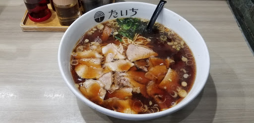 台風直撃の大雨の日曜日に伺いました。 長野市から下道3時間30分・・・・・ 11時30分到着。 この雨にも関わらず店内は満席、待合所に14名、店の外に10名並んでる。 普通だったら並ばないけど、なにせ「たいち」のラーメンの為に長野市から来たからね(笑 並び始めてからラーメンが出てくるまでに丁度40分。 この回店の速さ及び段取りの良さは流石です!