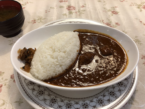 ほどなく到着したカレーですが、ルーの粘度は高め。昭和の時代を彷彿させる粉っぽさは無く、かと言って芳醇さ際立つ欧風という感じでも無く、昔の松屋のカレーのようなフルーティーな仕上がり。さっぱりとした口当たりなので、脂ものが続いていたこのタイミングではナイスな選択でした。