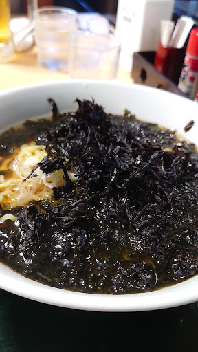 早速着丼 岩のりがてんこ盛りで丼の全面を覆い黒い。加水率程々かんすい系の中細縮れ中華麺が岩海苔の間からちょっと見える程度。 スープは鶏ガラをカエシで割った比較的あっさりの醤油。兎に角大量の岩海苔が風味よく麺に絡み、スープに溶けて終始いい感じで効いてくる。これは他にないと言えば無い特別な感じ