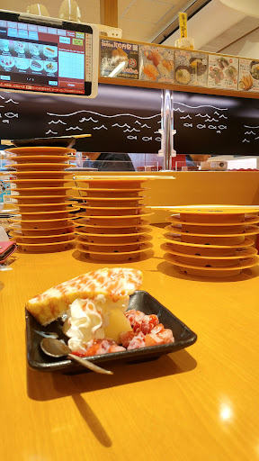 The sushi ordered comes on red plates. There is a cute chime that goes off when your order of sushi is near. There is a limit of 5 sushi plates that can be ordered at one time. A decent selection of dessert. This place does seperate...