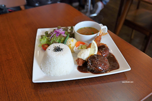 昔ながらの喫茶店のハンバーグのようなシッカリとした弾力を感じるハンバーグに大好物のエビフライを大盛ライス(大盛無料)でいただくと幸せな気分になりました。
