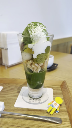 抹茶パフェ これもアイス、ゼリーとも抹茶が濃くて美味しいし、クランチかと思ったら煎餅が入っていてこの塩味がまた甘さをひきたてます。