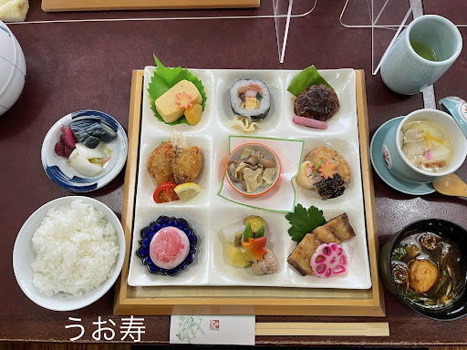 Read more日曜日の早めのランチで利用させてもらいました。店前に駐車場がある。11時半前で先客はなし。入口は段差あり。2階が食事処になっている。階段もしくはエレベーターであがる。中央が生簀になっていて、周囲に小上がりがある。テーブル席もありました。ゆったり食事できる感じです。筍目当てでしたが、まだ少し早い様です。今回はランチの日替わり御膳とお土産でたけのこ寿司に。甘味を含めて9品に御飯、赤出汁、漬物が内容。赤出汁は、少し甘い感じの味噌で、わかめ、アサリが入ってました。いろいろ愉しめて良かったです。お漬物は、長芋、壬生菜、たけのこですかね。美...