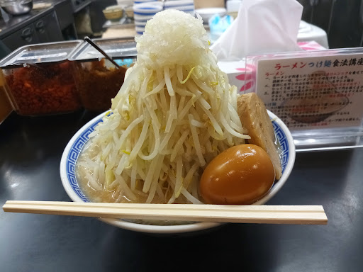 席に座りながら、作ってるとこ観察します。 どんぶりにスープと極太麺がまるで塊のように投入され、そこに野菜(もやし)が盛り付けられていきます。 えっ!まだ乗せるの?ウソでしょ!? 乗せるのではなく、まるで押し固めるかのようにもやしが積み上げられてます。 山のように積み上げられたもやしの山頂には、たまねぎをちょこんと。 それはまるで富士山をイメージするかのよう。 あっ!このお店の名前ですね(笑) 仕上げに所狭しと言わんばかりに、ぶ厚いチャーシューと味付け玉子を富士の裾野に収め完成のようです。