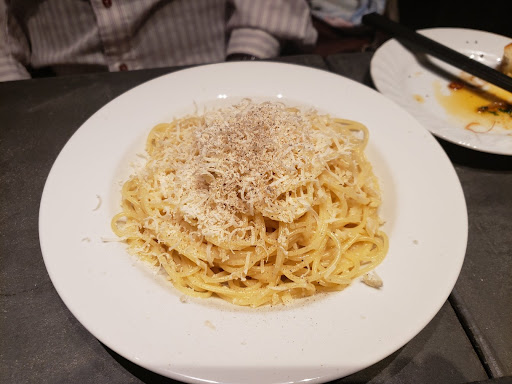 どれもある程度美味しかったし、値段も手頃でした。ワインやカクテルも美味しい系をおさえていて値段が手頃で、よそだと同じ値段で量が少ないけど、ここはコスパよかったです。 店主に尋ねて、前菜の盛り合わせ一人前だと二人で食べれないと聞いて、二人前を注文したのですが、一人前を二人で分けることができる内容でした。付きだしと重複した内容もあったので、余計に、一人前を二人でわけた方がいいと思いました。それで余計にお腹いっぱいになり、食べたかったメニューが食べれませんでした。ただ、前菜盛り合わせの中にとても美味しいものがあったので、注文はするべきと思います。野菜をたくさん食べたい方は、おすすめです。今回たまたまかもしれませんが、付きだしと重複しなければなおいいのでしょうが。 エビのアヒージヨや前菜等について来たバケットは、どれもちょうどいい焼き加減と歯ごたえで美味しかったです。ネットで見て、みんなが絶賛してたので注文したスパゲティは、パフォーマンスは楽しかったですが、私が濃い味が好きで溶けたチーズは好きだけど固形チーズは苦手のせいか、そこまで美味しいと思いませんでした。 海老のアヒージョも 口コミで絶賛されているほど 美味しいとは思いませんでしたが、よそで食べるアヒージョも毎回そうなので、私が アヒージョ 自体をそんなに好きではないためと思います。 こちらの好みの問題ですが、 アヒージョもパスタも そこまで美味しいと思わなかったため、すぐにお腹いっぱいになってしまい、少し残してしまいました。 ワインを楽しみたい方は、やはり前菜の盛り合わせに尽きると思います。 今回は、店主お一人で 調理もサービスもされていたので、出てくるまでに時間がかかりました。 これは逆に言うと、恋人同士、もしくは狙っている相手とゆったりと長い時間一緒に過ごしたい場合は、こういう店がお勧めだと思います。隠れ家的な店で お店の入り口も分かりにくく 入ってからも隠れ家の雰囲気が漂っています。店主もいい方でした。 ひとつ残念だったのは、 見た目、何かわからない虫が、いつのまにか前菜盛り合わせのきゅうりの上にずっと乗っていたことです。 そのキュウリを食べるのは諦め、他の料理につかないようにずっと手で払ってました。...