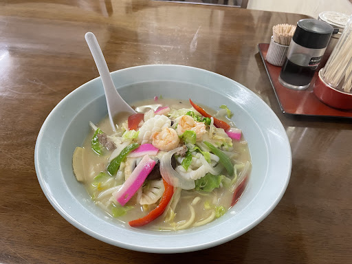 Read more多くの方がコメントしているとおり、ちゃんぽん、皿うどんの名店です。駐車場が1台と横付け1台しか車は停められませんので、お店に確認して行くことをおすすめします。私が行ったときもお店の方が停める場所を指示していました。 さて、ちゃんぽん食べ歩き10店目、娘との食べ歩き5店舗目となるこちらのお店は、芸能人もたくさん来店しているようです。ネットでも必ずというくらいおすすめの店に選ばれることが多く、私もぜひ行ってみたかったお店です。 4人卓が4つあるだけの狭い店舗ですが、ひっきりなしにお客さんが来るので、ほぼ満席でした。 ちゃんぽんと皿うどんを注文。先にちゃんぽんが来ました。こくがありつつもまろやかな味わい。イカも切れ目を入れており、丁寧な仕上がりになっていました。とても美味しかったです。娘はここのちゃんぽんがNo.1だと言っておりました。ただ、量がやや足りないと感じる人もいるかもしれませんね。 皿うどんはパリパリ麺と餡の絡んだ食感がとても素晴らしかったです。甘味もちょうどよく、そのままいただいても最高でした。また、金蝶ソースとの相性も抜群で、かけたらうま味倍増で絶品でした。 食べ終わった頃、大将が店奥から出てきて、コインとマッチ箱を使ったマジックを娘に披露してくれました。すごく嬉しかったようで、ここは最高だねと言っていました。私も次は上皿うどんを食べたいです。 別のお客さんがちゃんぽんの大盛りができるか尋ねていました。200円増しでできるとの事、それもいいなぁと思いました。