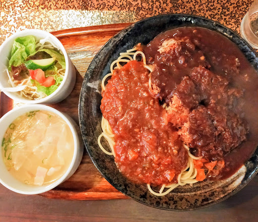 Read more飲食店の少ない、水の浦のバス停の前にあります。一押しはトルコライスです。 この店のトルコライスは、一般的なトルコライスではありません。ヒレカツカレー+たっぷりスパゲティ。写真はミートソースですが、カルボナーラもあります。ヒレカツはカリっと揚げられ、3枚がそれぞれ二つにカットされて食べやすいです、肉の味がしっかりした美味しいヒレカツです。深いコクと、少しの苦みを感じる美味しいカレーとからめて、格別の美味しさです。カレーは辛いのは得意ではない私にちょうど良い辛さです。 キャベツの優しい味のスープと野菜サラダは、良い箸休めになって、口の中をリセットできます。写真はレギュラートルコ(カツ3切れ)とスモールトルコ(カツ2切れ)です。レギュラーでも1000円しないのは、コスパすばらしいです。ボリュームは初老の私には、スモールでちょうど良いくらいです。 近くに住む友人は、平日限定?の日替わり定食が安くて、美味しいと言っていました。次は試したいと思います。 お客さんは多いですが、店の雰囲気は静かで、落ち着いて食事できます。近くに行ったら...