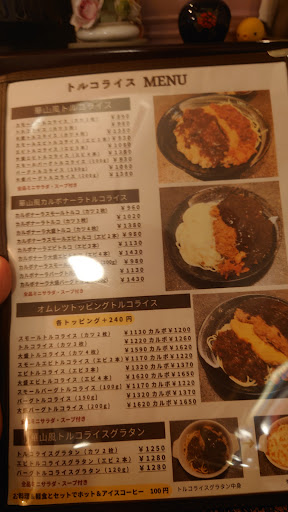 店内はレトロな喫茶店という感じで、ブリキのおもちゃなどがディスプレイされたいい雰囲気。4人がけのボックス席2つと、6〜7人座れるカウンター席のこじんまりとした店内ですが、店内の雰囲気が良いので、ゆったりと食事ができます。 メインメニューはトルコライスのようで、種類は豊富ですが、初訪問の本日はノーマルの華山トルコライスをオーダー。カツカレーとミートソーススパゲッティをワンプレートに盛り付け、サラダとスープが別皿。コッテリした見た目に、食べきれるかなぁと思いましたが、少し苦みが効いたカレーに酸味があるミートソーススパゲッティが好相性。サラダのドレッシングは酸味を抑えたオイルドレッシングで、スープはクタクタに煮込まれたキャベツがたくさん入ってなかなかに美味い。 いわゆるデフォルトのトルコライスとは異なりますが、全体の味のバランスがとれた、とても美味しいトルコライスでした。 びっくりなのが食後のコーヒーが+100円で頼めること。 喫茶店で出される淹れたてのコーヒーですので、味は間違いなし。連れの嫁さんはミニトルコを頼みましたが、女性には丁度よいボリュームだったそうです。 ご馳走様でした。 次回来店時は、カルボナーラトルコライスにチャ...