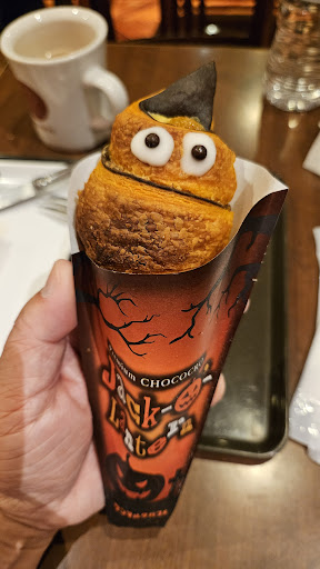 We got the hot royal milk tea, BLT (a hot sando with thick ham-like bacon) and one of their Halloween-themed chococro pastries decorated like a Jack-o-lantern. The BLT was quite good... as was the chocolate and sweet potato filled chococro.