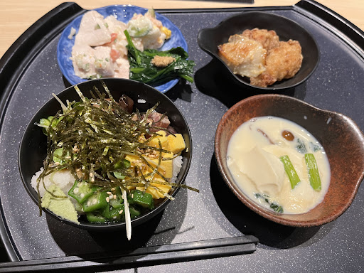 味は微妙かな。 海鮮丼は夜のメニューで余ったものを使われているのか、ご飯の上に載せて食べた時のドリップの魚臭さがとても気になりました。 またお肉と野菜の和え物のようなものもいただきましたが、お肉が繊維に対して真逆に切ってあり、微妙な食感。 良い素材の最大限出せる味を出しきれていませんでした。 また、アイランド以前から使われていたであろう古いガラスコップには白いくもりがあり、使いたくはなかったです。