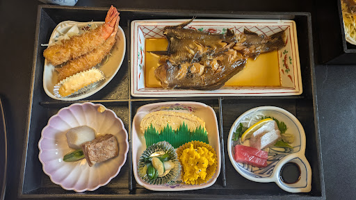 2024/2/12 建国記念の日の振り替え休日での訪問。 12:05に到着したけど入り口には準備中の立て看板が置いてありました。 「えっ!?」「この時間に開いてないの?休み?」 と、諦めてUターンしていたら、店員さん(大将?)が看板を取り 暖簾を掛けてました。 車を入れ直して訪問w 日曜日は松花堂ランチのみとの事でしたが、どうやら祝日や振り替え休日も同様のようです。 本日の松花堂ランチメニューは「カレイの煮付け 菜の花のお浸し添え」「4種の天ぷら(海老・白身魚・獅子唐・南瓜)」「お刺身3種(鮪・鰤・蛸)」「海老グラタン」「3種の小鉢盛り(南瓜サラダ・卵焼き・海老甘辛煮)」「茶碗蒸し」「お吸い物」「白ご飯」「珈琲」。 実は、くちぞこの煮付けを楽しみにしてたので 少しガッカリだったけど、出て来たもの全てが美味しかったです。一つも不味いと思ったものがありませんでした。 グラタンは想定外のメニューでしたが、ここ最近食べたグラタンの中で1番美味しかったです。 ツレも絶賛してました。 もっと食べたかったw