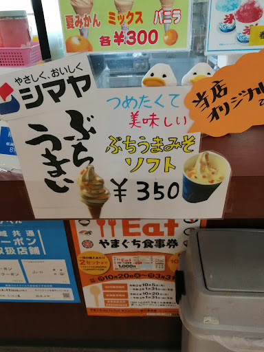 Read more海産物とお土産ものがおいてます。夏みかんソフトなど軽食もあります。休憩での立ち寄りも良さそうです。 今日はシマヤのぶちうまい味噌ソフトをいただきました。キャラメルソースに似た味で、塩気が濃厚さを出してました。トッピングにナッツを選んだのは正解でした。ソース少ないめが個人的にはよいと思います。