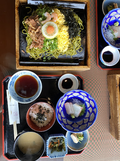 Read more油谷湾温泉ホテル楊貴館内に存在する和風レストラン。宿泊客以外の飛び込みでもランチが頂けます。 家族3人真夏のお盆にお邪魔。ホテルの駐車場は無料で。広くて停め易いのが良き。人気のレストランな様でウエイティングは4〜5組待ち。暑い最中、冷房の効いた広く涼しい館内で順番を待てたのがこれまた良き! 私は石焼御膳をオーダー。自分で石焼きで焼くお肉に、しじみ味噌汁、優しいお味の大根のそぼろ煮、茶碗蒸しにはこれでもか!位ふんだんに入った百合根に感激。大好きな銀杏もイン。それに串揚げが3種も。お腹いっぱい満足満足。 また、食事しながらの景観も素晴らしい。大きな窓からは青く美しい油谷湾が一望できます。 メニューが豊富なのも人気の秘密かな?山口名物【瓦そば】もありました。あまのゆさんはホテルご飯なのにリーズナブルなのが凄いポイント高いです。夫は肉かき揚げうどん、娘は選べる釜飯御膳を堪能。素敵な景色までも堪能して3人で¥52...
