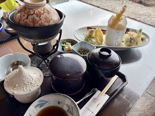 楽しみにしていたランチは「あまのゆ」へ。私は「七種の天麩羅御膳」(1,870円)を注文。写真の通り、海老や旬の山菜など、揚げたてサクサクの天麩羅を堪能できました。御膳には、土瓶蒸しや季節の小鉢も付いており、地元の食材を繊細な味付けで楽しめます。