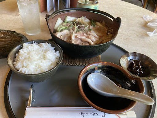 空いてるテーブルへとの声で入り口近くの窓際に座り、鴨鍋定食1,600円(税込)を注文。鍋にしては早めの15分位で提供されました。濃い目の和風出汁の中には大きめの鴨薄切り肉が7枚、豆腐や葱、しめじ、えのき、水菜、白菜とバラエティに富んだ中身。お味は普通に美味しいレベルですが、この高め設定な価格帯は県境だからなのでしょうか。鴨肉は珍しいからかな?お肉も柔らかくて出汁で良いお味でした。量もあり、定食なのでワンドリンク付きでした。