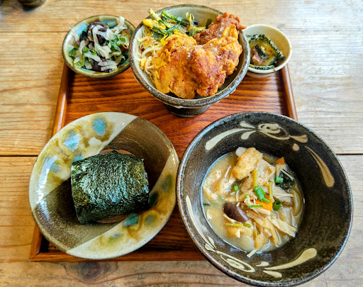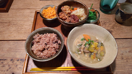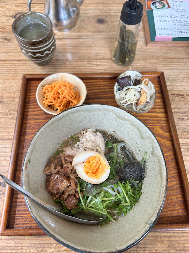 Read more素泊まり旅行で酒を飲まないので、普通の定食などの夜ご飯を食べられるところを探すのに苦労していました。始めに行こうとしていた場所が休業で4軒目でした。一つ一つ作ってくれているらしく、しばらく待ちました。玄米ごはんに、具沢山の味噌汁。カリカリのから揚げ、アジア味の酢の物、ニンジンの千切り。まったく想像がつかなかったのですが、店の方に聞いてみるとかぼちゃの新芽がありました。食べたことなかったので、くせのない味に驚きました。食後の飲み物はベトナムコーヒー。ヨーグルト入りは飲んだことないですが、濃厚な甘さでした。デザートはココナッツが入ったケーキ。食べ物だけでなく、器が美しく、おいしい食材をさらに引き立てていました。から揚げが盛り付けられた皿は沖縄の少し背の高い皿。店で器も販売されていました。これで1200円とは良心的です。調べ不足でこの店に気が付かなかったのですが、知っていたら初めか...