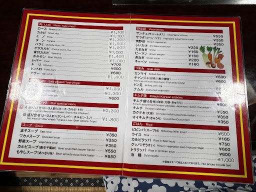 This is my everyday yakiniku restaurant and I rotate it heavily. It is reasonably priced and you don't have to worry about many things if you share a course rather than a la carte. I recommend the Assorted Course A. It is 2,300 yen for 2-3 people and includes loin, ribs, and chicken. If you need more, add more. We are always satisfied with one course for three people, which is good for both our stomachs...
