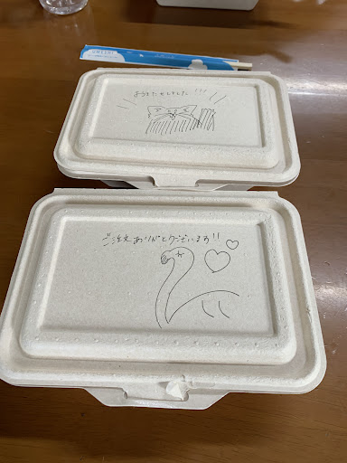 たくさんのお客さんをお二人だけの店員さんが上手に接客されてて、 そんな中で私達が2人前注文したカルビ丼?がたまたま1人前しか通ってなかったようで、 《全く急いでないので、ゆっくり、うちはいつでもいいんで、手が空いたら作ってください(^^)》と言い、ゆっくり待っていたら、こんな素敵なメッセージを容器に書いてくださってて、感激…!!! 嬉しさに家族全員が声を上げました! ありがとうございます…!