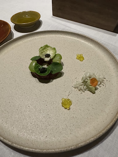 🌹鮪とズッキーニのクリーム 新鮮な鮪に泡のシークワァーサーをつけて食べて サッパリな味わい。ズッキーニや海ブドウが飾られて 見た目も可愛い。 ピスタチオの粉末をつけるとアクセントに良いなります。