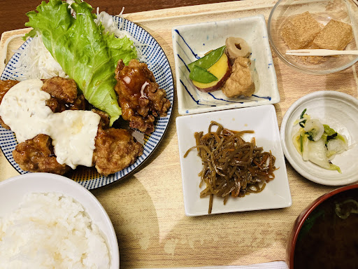 鶏と温野菜の香味たれ御膳 二口位で食べれる丁度いい大きさのから揚げに、大き目にカットされた野菜 香味野菜ソースがタップリかかっている、 個人的に近いと思ったのは油淋鶏 普通に美味しいが、野菜が沢山食べれたのは嬉しいし、チョットくる酸味が良い 小鉢のきんぴらゴボウも美味しく頂きました ご飯のお替り、大盛りは無料なのもいいが‥ 不満もある? から揚げも温野菜も熱くなかった 小鉢2品のうちのさつまいいもは美味しかったが、厚揚げ、竹輪は味がない? 個人的にお味噌汁も味を感じない? ここまでだと評価は低いのですが お店のコンセプトが、新鮮で出来立ての美味しさ、身体にいい‥‥、だから メイン料理はチャンと味はあるが、脇は薄味と料理に緩急をつけている これを知らないと不満に思うかも?、 食べる時知らなかったが、コンセプトを読んで納得、身体に優しくでき、美味しく頂きけたと思います 煮物、お味噌汁をもう少しだけ美味しい薄味にしてくれたら‥‥ ご馳走様でした 星3.5