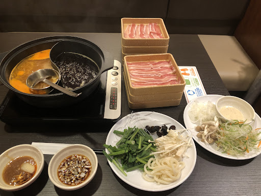 Second time I went there by myself I had a great meal. I went for the pork belly set and they even gave me free 2 sets of black pork. It was so tender and it has a different texture than the regular pork belly cut. I added drink bar for an additional fee. Got the most common sukiyaki broth (great with udon) and spicy korean broth base (level 1 not spicy at all, I’d recommend you choose level 3 if you want it spicy) for an additional fee too. The vegetables were fresh. One thing though, I had trouble making the sweet sesame dip. They don’t have it. The desert bar was nice too and there’s a waffle bar you can cook your own. All in all a lovely...
