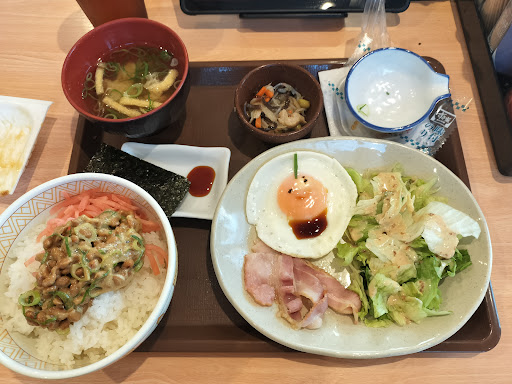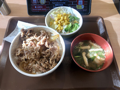 Read more私はここのすき家さんを、7月28日AM3時頃に利用しました。深夜の為、客は私1人だけでした。入店すると、心を落ち着かせるジャズ音楽が流れていました。注文方法はテーブルの前にタブレットがあるのでそこから注文します。私は牛丼大盛り、味噌汁、卵の3点セットを注文。注文してから2分程で非常に早いと思いました。卵をかき混ぜ、牛丼へピットイン❗️そして1口。新鮮な卵と牛がマッチングして私の口の中でコサックダンスを踊っているではありませんか! 味噌汁の方も一口。インスタント感は否めないですが味噌が口の中で阿波踊りをしていました! 店員さんの愛情、情熱が伝わった3品でし...
