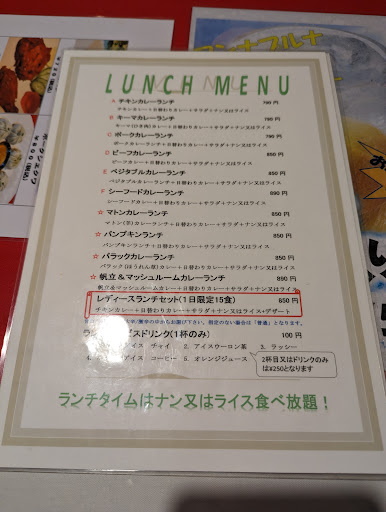Read more平日13:00に行きましたがテーブルは半分以上埋まってました。 レディースランチは15食限定とのことでもうないかな?と思いつつ注文するとまだありました。もっと遅い時間でも大丈夫だったこともあるので、もしかしたら限定といいつつ限定じゃないのかも知れません。 890円でチキンカレー、日替わりカレー(店の外、入口の辺りに今日の日替りが書いてあります。今日はチキンとマッシュルーム)、サラダ、ナンかライス、ドリンク、デザートとお得。普通のセットはドリンクとデザートは付きません。 たまたまかも知れませんが日替りには大抵チキンが入っているのでせっかく二種類のカレーなのにチキンかぶりになります。 ナンを選んでもサフランライスが少しつきます。もちもちしてて美味しい。 カレーは甘口で他店の普通くらいの辛さです。柔らかいチキンが沢山入ってます。マッシュルームが見当たらなかったのでほぼ同じカレーが2つになって残念。 ナンはサクサクとふっくらの部分がありかなり好み。お代わりもいいタイミングで聞きに来てくれるので小さめでお願いします。 デザートはマンゴーピューレのかかったヨーグルト。酸味が無いので自家製かも知れません。 ホットチャイはもう少しスパイスをきかせてくれたらいいなと思います。 外の看板とテーブルに置いてあるメニューの値段が違ってます。最近値上がりして、外の看板を直し...