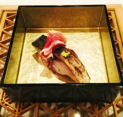 小點心之後就是前菜們,有嫩到不像話的舒肥雞胸,搭配烤蘆筍、柚子胡椒跟彩椒,還有一層像果凍的裝飾;冷湯是櫻花酒粕蘿蔔,搭上一片櫻花葉子跟麻糬,有一點點像櫻餅,這也是我愛在日本吃西餐的原因,他們很巧妙的融合了日本的食材跟元素,碰撞出西餐不一樣的層面!