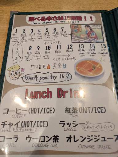 Read more土曜日ですが、ランチで利用しました。インドカレーの辛さが15段階まであり、辛さが得意ではない自分は3のピリ辛を選んで食べました。ピリ辛でも辛くなくたべることできました。辛さを求めている旦那は挑戦で6の超辛を選びました。一口いただきましたが、口にいれて舌にカレーをのせ味わうと辛く後も辛く飲み物が沢山入りました。辛さを求めて美味しく食べるには5位が良いと辛いもの好きが言ってました。私はピリ辛が辛くなくマイルドに食べることができたので次は4を食べてみたいと思いました。ナンの大きさは程よく一枚目食べると次のおかわりの大きさ調節できるので助かります。子供はキッズナンを食べてました。ナンを気に入ってカレーをつけてパクパク食べてました。かなり量減っていたのでよかったです。カレーの美味しさとドリンクもラッシーとチャイ美味しく、接客は店員の皆様感じ良くて、忘れ物しても丁寧に応対していただき、辛さに関して問い合わせてをしたときもわかりやすくて、好感ありました。リピート機会あ...