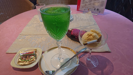 Read more愛知日産で車の点検に❤️1時間30程時間がかかったので🎵喫茶で😃まったりです‼️😋店内はテーブルにピンクのクロスがあります🎵西洋文化を感じます🎵メロンソーダとホットドックを😃お願いしました❗メロンジュースとアイスクリームが別々のグラスに❤️グラスや食器は品格のある素敵な物です‼️😋お店の方々は美しく貴賓を感じます🎵ホットドック❤️も美しいんです‼️ミントとオレンジ🍊が、可愛らしいですね�...
