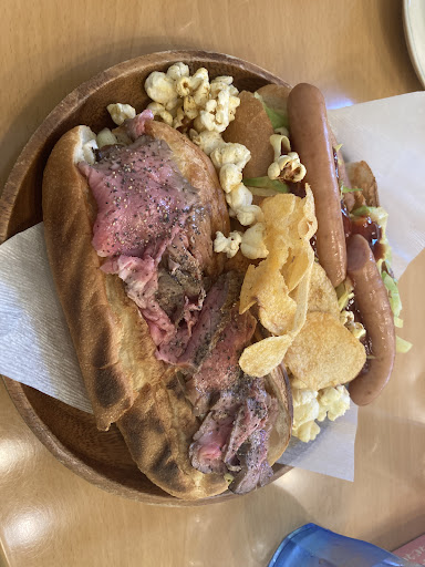 ポップコーン🍿とチップス🥔と共に盛られた美味そうなホットドッグ🌭🌭 ローストビーフドックから一口… しっとり柔らか、中のコールスローとの相性も️🙆🏻 それとパンが旨い! コッペパンでもフランスパンでもない、ソフトフランスやろか? サクサクでふんわり𓈒◌𓐍𓈒°𓈒◌𓐍𓈒