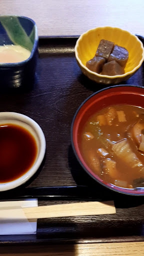 味噌汁は、ちくわなど具だくさん。 小鉢でこんにゃくのピリ辛和えなどもあり、満足度の高いものでした。