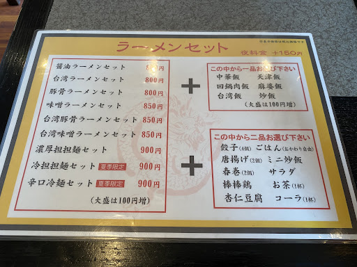 追記:台湾ラーメンは2種類あり、濃厚台湾ラーメンはいわゆる台湾ラーメンとは違って爽やかですが辛さが際立っていて美味です。 お酒のおつまみも豊富です。 オススメは小袋、四川風ワンタン、センマイです。 特に小袋は臭...