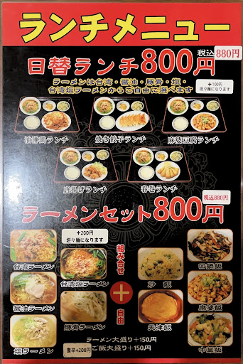 今回は、ラーメンセットの「天津飯」+「台湾豚骨ラーメン」を食べましたが、どちらも美味しくボリュームもあって満足感は大きいです。天津飯は玉子がふわトロ仕上げで濃い目の中華餡もよく絡んできてご飯と共に食べると絶品の味わいです。台湾豚骨ラーメンを初めて食べましたが、こちらもかなり美味しいです。辛さは控えめでランチタイムにはちょうどいいと思います。コストの関係で共に具材は少なめですが、コスパとしてみたらかなり良いと思います。オススメです。