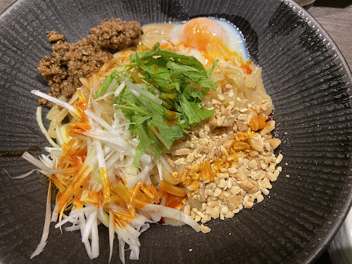 Read more券売機で発券しカウンターから渡す良くあるシステム 初来店なので無難に 温玉ナッツ入り汁なし担々麺を注文 ご飯or杏仁豆腐を無料で選べます。 上にかけるラー油をノーマル、控えめ、 かなり控えめから選べるのと事で 控えめを注文 控えめでもまぁまぁ辛いです。当方辛いのは好きですが丁度よい 辛さでした。 定休日は水曜 11:00〜15:00までの営業で いわゆる夜の部はないみたいです。 お値段はちょい高めですが物価高のご時世 場所柄も考えれば頑張ってる値段設定かなと思います。
