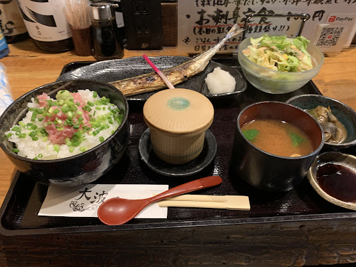 2024年10月2日(水) ランチに新さんまが出ていましたので、漏れなく利用させて頂きました。秋刀魚とネギトロごはんとお味噌汁にサラダと茶碗蒸しと小鉢の内容で千円以内で頂けることに感謝です。