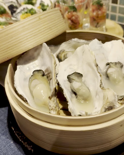 せいろで蒸されてすぐに提供される蒸し牡蠣。 火が通ると甘みが増しますね♪ 固くならない絶妙の火加減でプリップリで絶品!