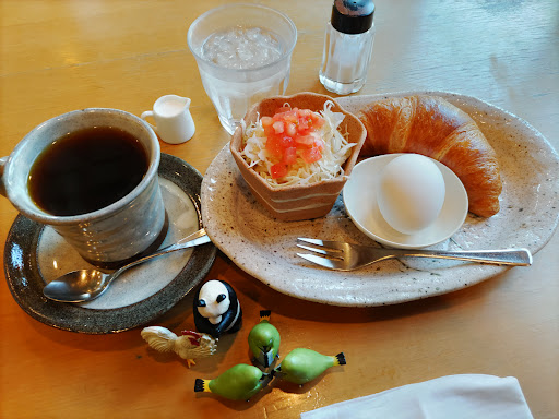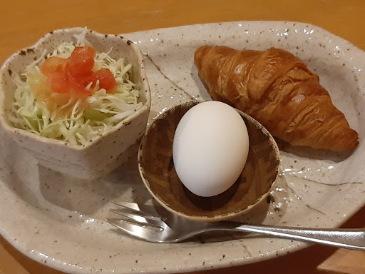「サービスモーニング」+0円 ドリンクのみでつきます。 焼きたてクロワッサンとゆで玉子にサラダ。 サラダもデフォルトでつくのは嬉しい人が多そうですね。 クロワッサンはミニサイズなのでこれでボリュームあるとは言えませんが無料モーニングとしては十分です。