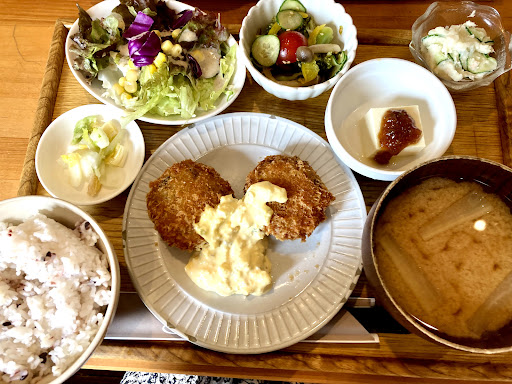 注文したのはこ ・こだわり定食(メイン1品+副菜3品+サラダ+みそしる+雑穀ごはん)でサーモンとほうれん草のクリームコロッケ……1240円 ドリンクはセルフで飲み放題となっていて、コーヒー(HOT&ICE)、韃靼そば茶、ハーブティー、はちみつレモンティーなどなど種類豊富に用意されていて楽しいです。 席にもアルコールがあり、食事時以外はマスク着用を励行されているようで、感染対策にもとても力が入っています。 しかしヒリヒリした感じはなく、接客されているお姉さんはとても気持ちよく対応してくださいました。