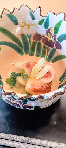 冷鉢 冷やし加茂茄子と車海老芝煮、蒸し鮑取り合わせ トマトのジュレ、茗荷と青紫蘇スプラウト