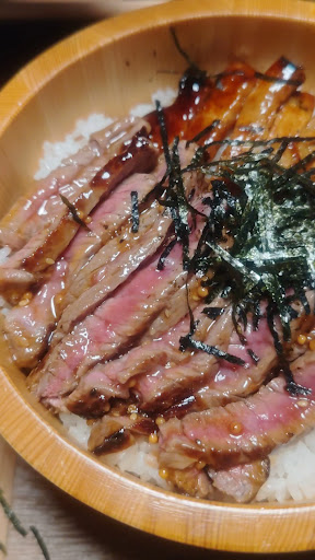 Read more店構えとは裏腹で、店内は和モダンな落ち着いた内装でBGMが良い雰囲気を作っています。牛と豚の肉まぶしを頂きましたが、お肉は美味しいですが少し冷めてたのが残念です。牛ももう少し火を通したほうが食べやすく味も染みると感じました。セットの中にタレが付いて来ますが、最初からしっかりかかってますので不要です。これをつけるなら最初はもう少し少なめな味付けのほうが良かったです。あと、おすましか味噌汁が付いていると良いと思いました。鰻のひつまぶしでも必ず肝吸いは付いてますよね?!そして何よりガッカリしたのは出汁がぬるい状態でした。出汁はアツアツを提供して欲しいです。更に、2人で同じ物を注文したのですが、同時に提供されず、一方が1杯目を食べ終わった頃にやっと2人目が提供されました。同時に調理してるとしたら、2人目はもっと冷めてたと思い...