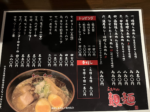 初見ではなんと読むのかなかなか分かりづらく、読み方を聞いてもなんのことやらそれはそれでよく分からないラーメン屋さん(効果覿面のてきめんとかけてあるような気はするが) メニュー的には味噌ラーメンがど真ん中メニューのようで、あとはアレンジメニューやサイドメニューが色々と賑やか。 味噌ラーメンそのものはよい意味で至って普通。ラードかな?それ系の脂感とニンニク感たっぷりのパンチあるスープは飲み帰りの深夜に食うにはまあまあ堪えるものがあるが、空腹時に食うとたまらなく美味いと思う。麺も縮れ麺がよくマッチしていて、味噌ラーメンとしてまとまりが良い。 ただ、せっかく脂の香ばしさを食わせる味噌ラーメンなのだから、この手のラーメンにはもやし、きくらげ、にんじんなどの野菜類を同じように香ばしく炒めたものがいわずともどっさり乗ってくることを期待してしまう。 他のラーメンみたいにメンマやネギ、申し訳程度のもやしがちょろっと入っている程度では、味噌ラーメンを食う嬉しさも半減する。 トッピングで野菜増し200円というのがあるが、それを頼めばよかったのだろうか? 味噌ラーメンで野菜に別料金取られるのはなんともモヤモヤするものを覚えてしまう。 醤油ラーメンはきのこ系の香りがきいたスープで、他にはない味わい。油の香ばしさもあって、なかなか食べ応えがある。 ラーメンは美味しいし、格闘家みたいな体格の店主の愛想もいいので...