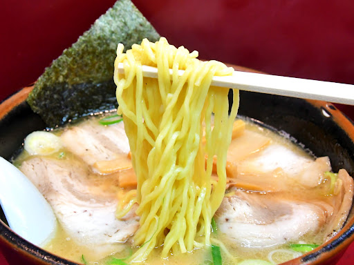 チャーシューをかき分け、持ち上げた麺は緩やかな縮れががあり、濃厚でまろやかな風味の豚骨スープがしっかりと絡んできます