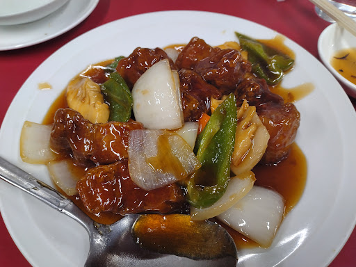 酢豚、最高に旨かったです。自分史上最高の酢豚。豚バラブロックをカリッとした衣が覆い、ジューシーな脂を閉じ込めていて、甘酢も酸味、甘味が丁度よく肉とマッチしていました。黒酢系ですね。ケチャップじゃないです。フルーツは入っておらず野菜はタマネギ、ピーマン、ニンジン。ニンジンはなぜかT字。ひとりでぺろりといけます。 本当はスペアリブの黒酢餡掛けが有名です。酢豚を食べてきっと美味しいのだろうと思いました。骨が苦手でなければ。